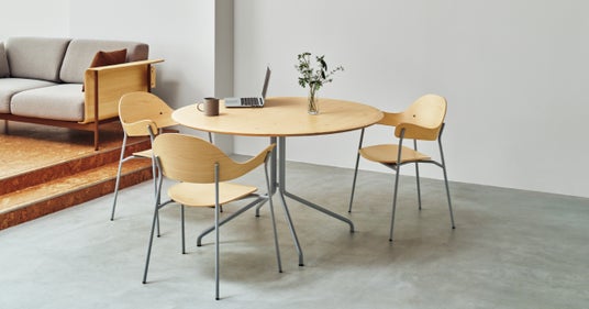 その「yuimori」の第四弾として、「ym-04」カフェテーブルシリーズを発売します。プロダクトデザインは、建築から家具デザインまで幅広く活躍する芦沢啓治氏とコクヨのプロダクトデザイナーが共同で行い、自然を想起させる軽やかでオーガニックなフォルムと優美な曲線が特徴です。使用後は素材ごとに分解可能な設計を実現し、素材選定だけでなく構造面でもサステナビリティに配慮しています。