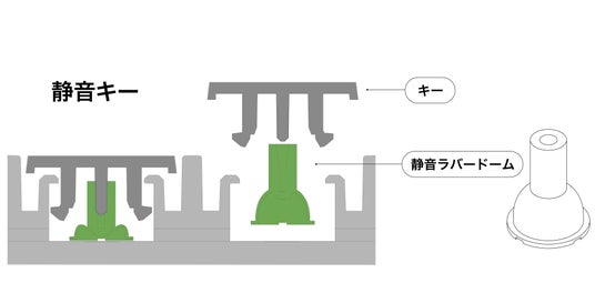 - 静音ラバードームがキーと本体の接触をタイピングの際の更なる静かさを実現