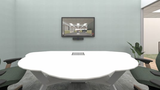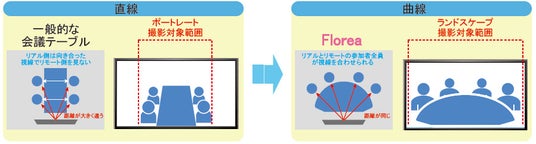 「Florea(フラリア)」は、テーブルの配置をポートレート(縦長)からランドスケープ(横長)に変更することで、従来の長方形テーブルとは異なり、参加者全員がカメラに対して等距離に着席できる設計を実現いたします。