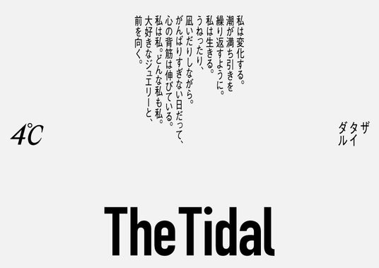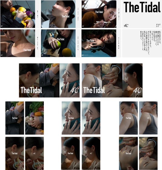 4℃の新たな挑戦として発売した、日々変化する女性の気持ちにフィットするモードスタイルの新ライン「The Tidal(ザ タイダル)」。新ビジュアルでは、通常はジュエリーやファッションのビジュアルでは取り扱われることの少ない、毎日の買い物や昼食、仕事、休日の家時間や友達とのお出かけなど、女性のリアルな日常を描きました。それだけでなく、そこに暮らす女性の自分なりのこだわりや価値観、好奇心を持って過ごすアクティブな心の動きまで表現。各シーンの中に「The Tidal」のジュエリーが凛と輝いている様子を映しました。