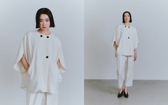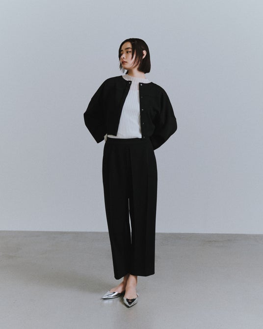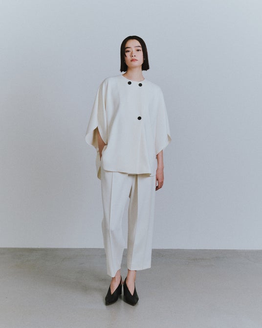 ポンチョのような丸みのあるシルエットのノーカラージャケットと、フロントに大胆に配したタックが目を引くセミワイドパンツのセットアップ。