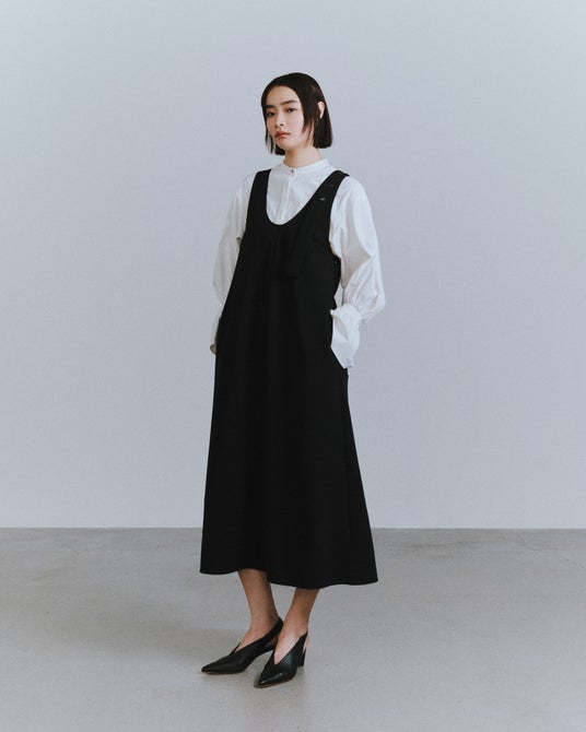 スカート派の方におすすめのジャンパースカートタイプのワンピース。アシンメトリーなショルダーストラップとAラインシルエットで、きちんと感がありながらもリラクシーな着心地がポイントです。