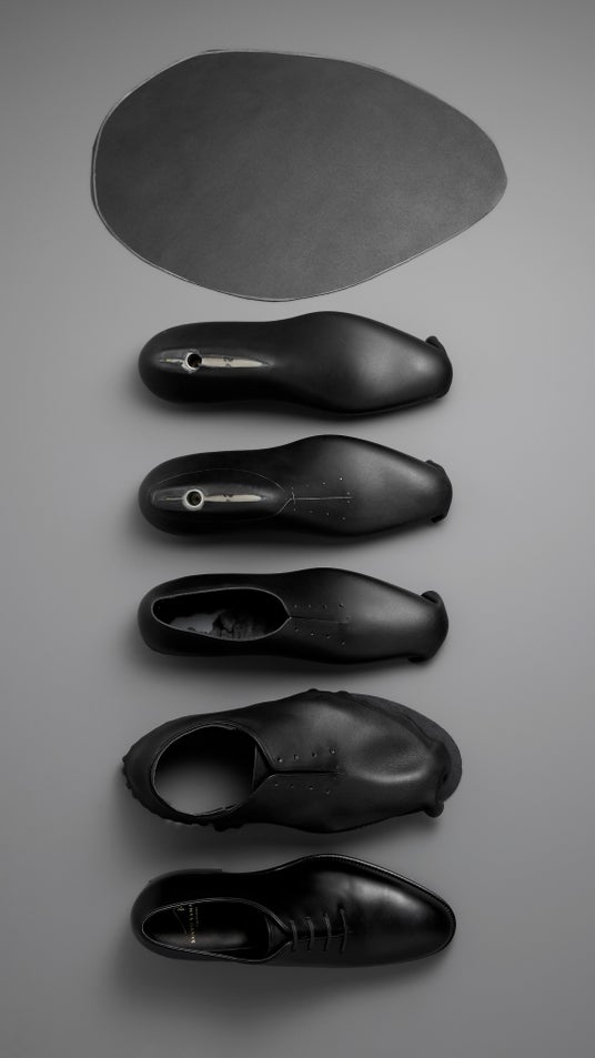 ゼロシーム仕立ては、極めて特殊な作り方によって完成します。一般的な靴の場合、まずはアッパーのデザインに即して各パーツを革から切り出していきますが、ゼロシームは一枚革ゆえそれがありません。アッパーの革のパーツは、楕円形にカットされた1点のみ。原型は驚くほどシンプルです。それを木型に吊り込み、靴の形にしていくわけですが、これが一筋縄ではいきません。まず、パーツが極めてシンプルなため形を出すのが困難です。吊り込んだあと、通常よりもはるかに長い時間をかけて木型の形を定着させる必要があります。さらに特殊なのは、実質2回吊り込みを行わなければいけないことです。革を木型に吊り込んだ状態で履き口や羽根周りの位置決めをしたら、一度革を木型から外し、デザインに沿ってカットと縫製。この段階でライニングのレザーも取り付けます。その後、再び木型へ吊り込んで底付けをする、という具合に、通常の倍の手間を要するのです。