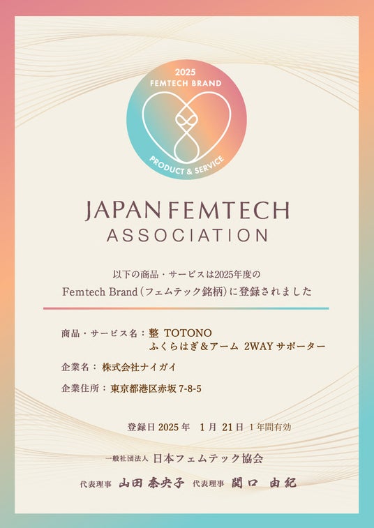 株式会社ナイガイ(本社:東京都港区赤坂 代表取締役社長:今泉賢治)は、一般社団法人 日本フェムテック協会のFemtech Brand(フェムテック銘柄)Projectにエントリーをし、整 TOTONOの「ふくらはぎ&アーム2WAYサポーター」がフェムテック銘柄の認定を取得いたしました。