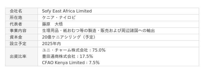社名「Sofy East Africa Ltd.」には、ユニ・チャームの女性ウェルネスケアブランドでもあり、生理用ナプキンブランドでもある『Sofy(ソフィ)』を起点として、東アフリカ地域の女性の健康と尊厳を守り、自信を持って活躍できる社会の実現に貢献したいという想いを込めています。また、“East Africa”という名称には、将来、ケニアだけではなく周辺国へも価値を届けていくという想いを込めています。合弁会社の概要