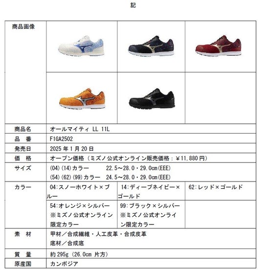 ミズノは、主に建設業や運輸業などの現場作業者向けに、ミズノのワークシューズ史上最軽量モデル※1「オールマイティ LL 11L(エルエルイチイチエル)」※2を、ミズノワーク品を取り扱いする全国の作業用品専門店やホームセンター、ミズノ公式オンラインなどで1月20日に発売します。