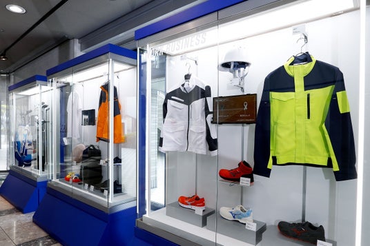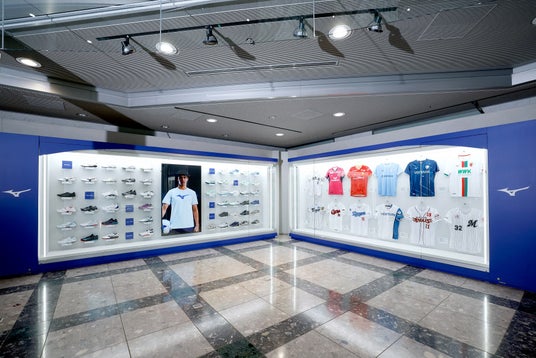 今回のリニューアルでは、1階にさまざまなカテゴリーのシューズをはじめ、プロ野球やプロサッカーチームのユニフォーム、ゴルフ・野球といったスポーツ用品の展示や、近年ミズノとして成長カテゴリーと位置付けているワークビジネス、スポーツファシリティ部門での取り組みなど、現在のミズノをご覧いただけるコーナーを設けました。