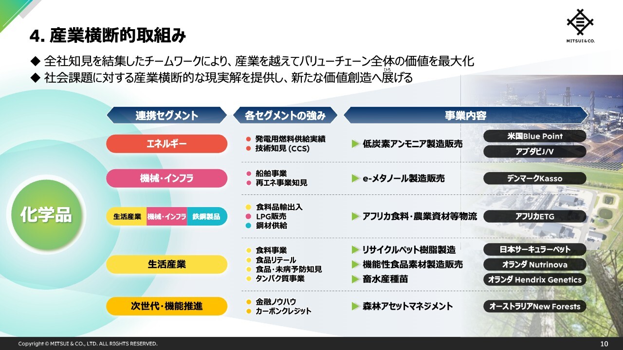 4つ目の強みである「産業横断的な取り組み」についてご説明します。もともと化学産業はさまざまな素材を中心に裾野が広く、多くの産業との接点を持っています。当社の化学品セグメントは、原料・素材から機能材料まで、幅広い領域をカバーしており、この知見の広さと深さを生かして、他セグメントと連携した産業横断の取り組みを進めています。