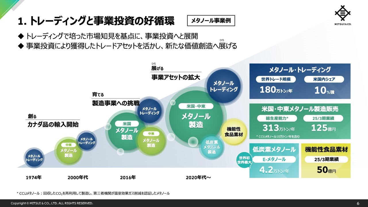まず1つ目の「トレーディングと事業投資の好循環」です。当社のメタノール事業は国産品の取扱いからスタートし、1974年には価格競争力の高い海外産品の輸入に踏み出し、カナダからの本格的な輸入を、業界に先駆けて開始しました。
