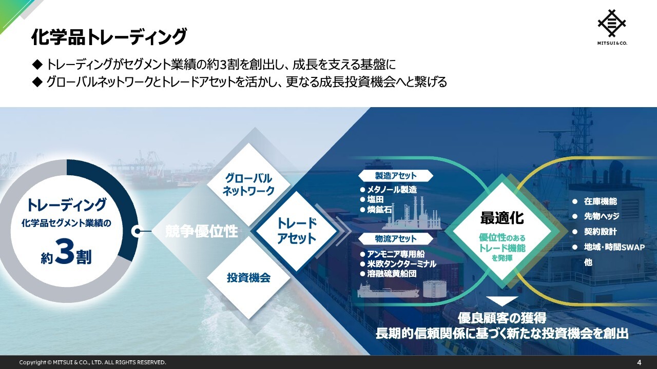トレーディングは現在、利益ベースで約3割を占めており、今後も事業の基盤として強化していきます。一方で、事業投資とトレーディングを分けて、トレーディングだけを伸ばしていくことは考えていません。先ほどご説明したとおり、供給や購入に関する物流契約と、製造事業やタンクターミナルなどの物流機能を結びつけ、これらを総合的に組み合わせてビジネスを拡大していくということです。特別にトレーディングだけを成長させるのではなく、トレーディングと投資を組み合わせて機能を発揮することで、結果として化学品セグメント全体のビジネスが増えていくと考えています。