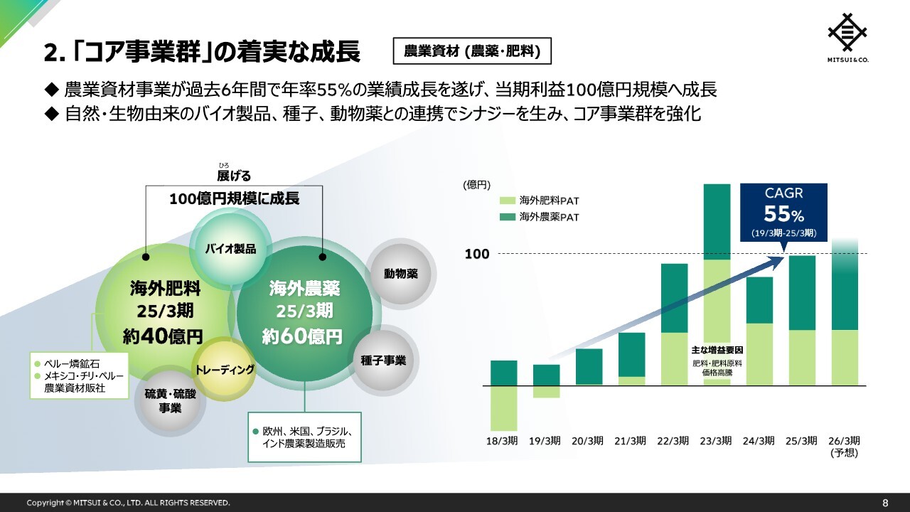 農業資材事業も、南米の上流権益や欧州を中心とした販売網をベースに、コア事業へと成長しています。