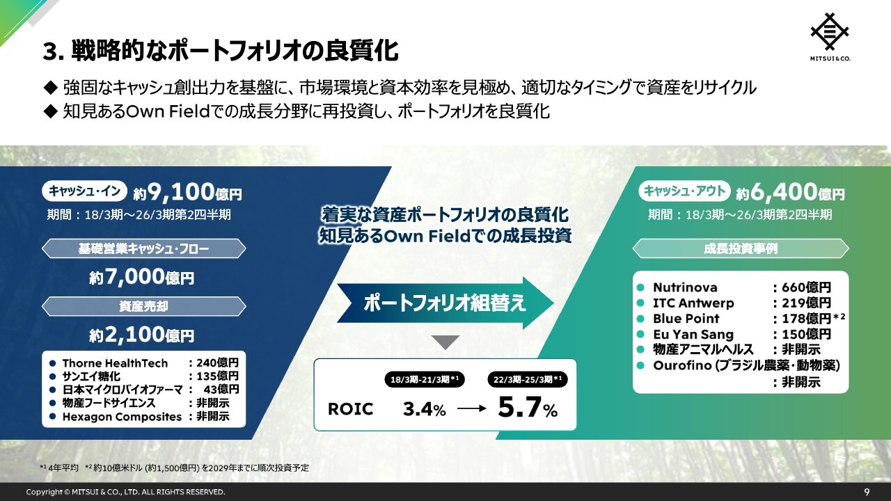 この期間の累計の基礎営業キャッシュ・フロー7,000億円と資産リサイクル2,100億円を合わせて、合計9,100億円のキャッシュを獲得、それをベースに6,400億円の成長投資を実行しています。