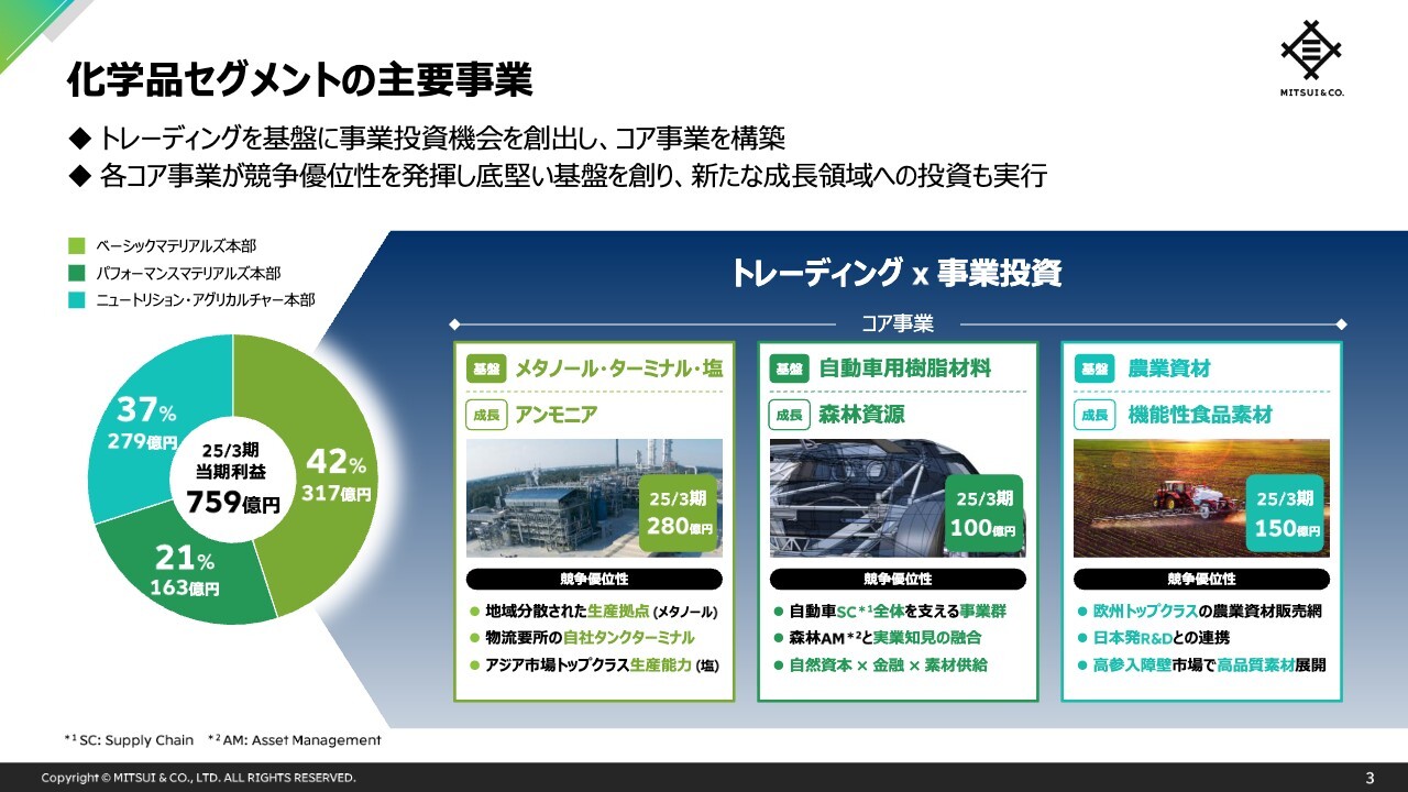 これに加え、成長領域として「アンモニア」、「森林資源」、「機能性食品素材」などを、新たなコア事業とすべく、投資を開始しています。