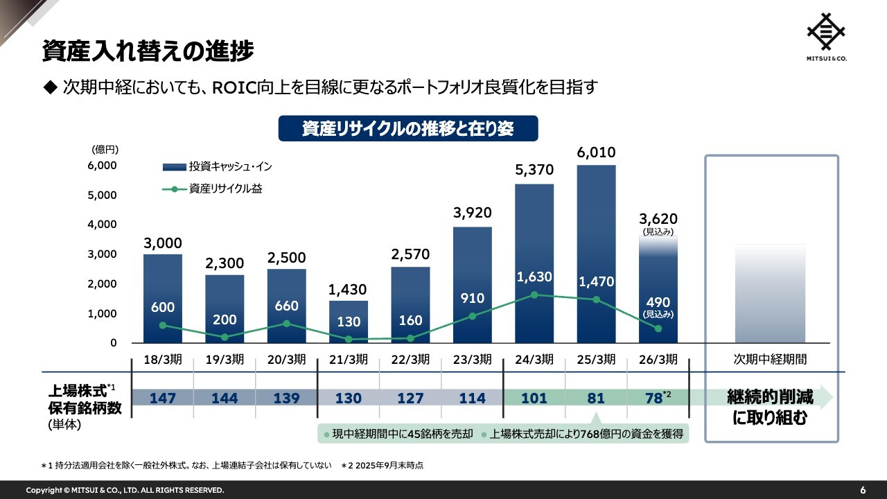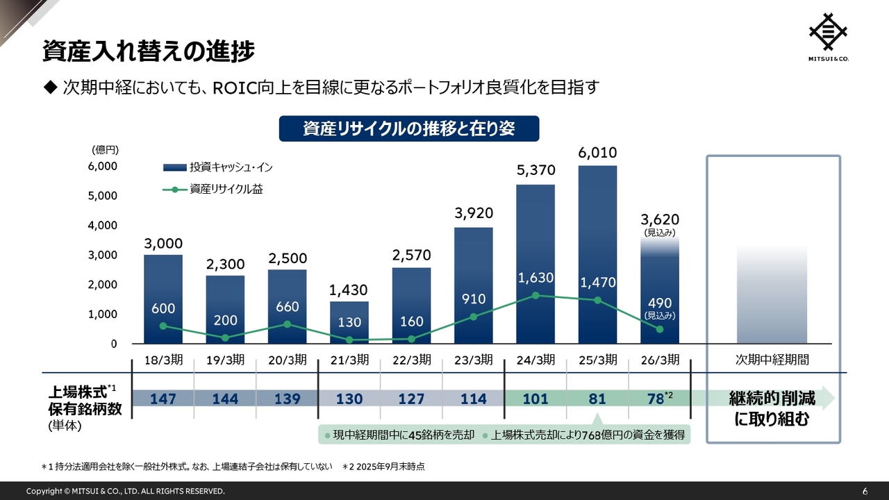 現中経期間中では年間平均5,000億円程度の資産リサイクルとなる見通しです。レビューポイントに基づき、一定の利益を上げている案件に関しても売り時を見極めて入れ替えを進めた結果、過去と比較して獲得資金や売却益を増やすことができています。また上場株式に関しても、2018年3月期から2025年3月期にかけて約半数まで削減してきており、現中経期間中に45銘柄を売却、約770億円の資金を獲得しています。