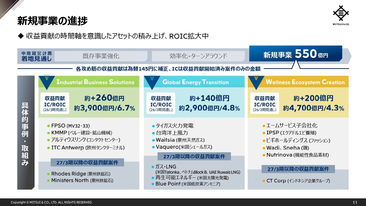 質問者:新規事業の進捗について教えてください。スライド11では、3つに分けて、投資額やそれに対するリターンが示されています。例えばIndustrial Business Solutionsについて、2027年3月期以降の収益貢献案件としてのRhodes Ridgeに大きな投資額が入っていて、約3,900億円のInvested Capital(IC)にはおそらくそれが入っていないと思います。