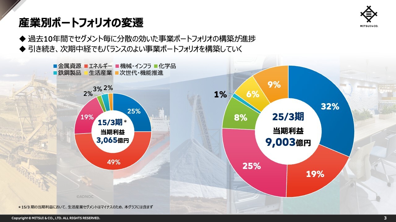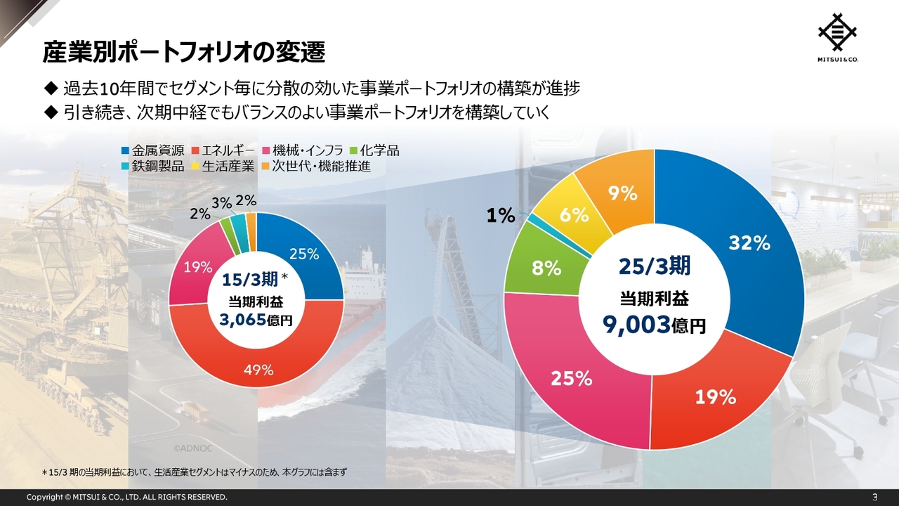10年前にあたる2015年3月期のセグメント別当期利益は、金属資源・エネルギーの割合が全体の7割以上を占める構成となっていましたが、この10年間で利益の水準も約3倍に伸長し、機械・インフラ、次世代・機能推進、化学品、生活産業等の事業が成長した結果、金属資源・エネルギーとそれ以外のセグメントの割合が概ね半分ずつというバランスの取れたポートフォリオへと変化しました。