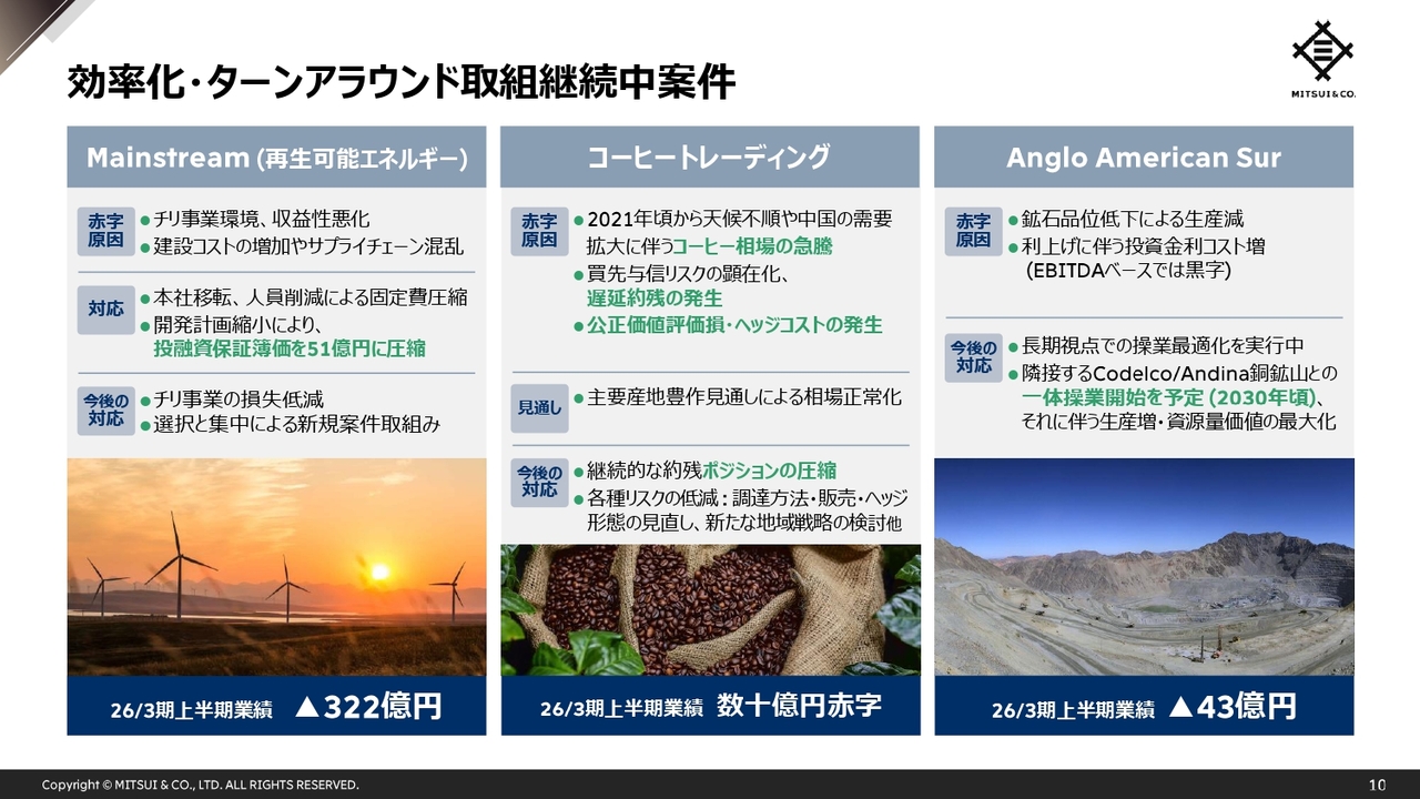 チリ銅事業のAnglo American Surは、鉱石の品位低下により生産量が減少し、それでもEBITDAベースでは黒字となっていますが、利上げに伴う投資金利コストの増加の影響もあり、当社の投資子会社は赤字となっています。