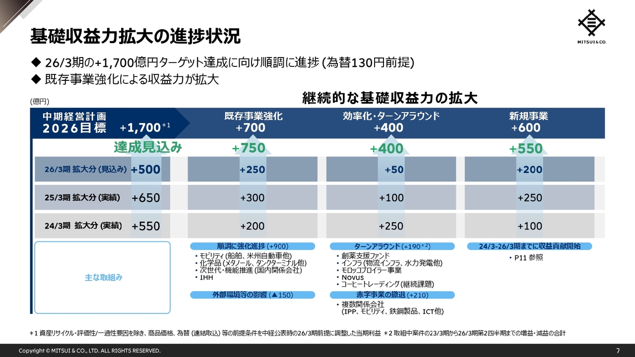 商品価格・為替を中経公表時の2026年3月期の前提に調整し、一過性要因等を除いた当期利益を基礎収益力として、中経3年間で1,700億円拡大することを目指していますが、達成に向けて順調に進捗しています。ここでは米ドル為替を130円前提としています。
