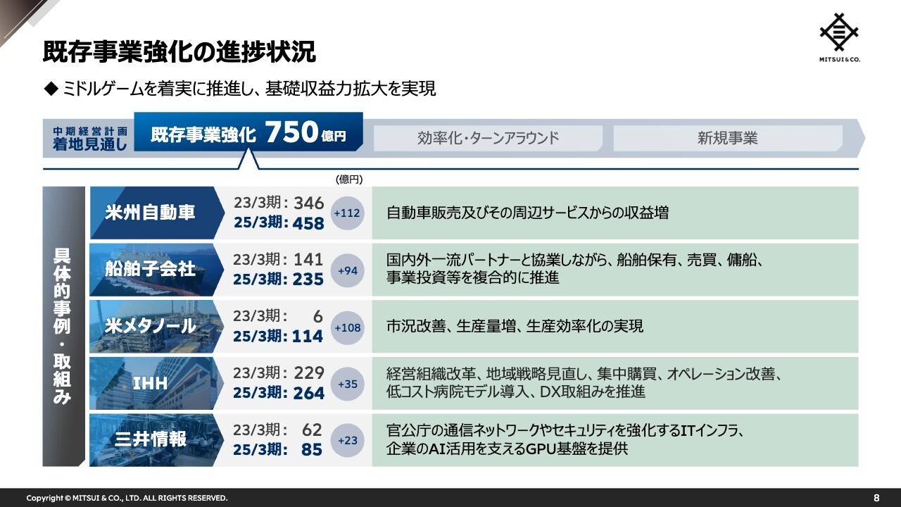まず、こちらでは既存事業強化の進捗について、2023年3月期から2025年3月期にかけて基礎収益力の拡大が大きく見られた事業をいくつかご紹介します。