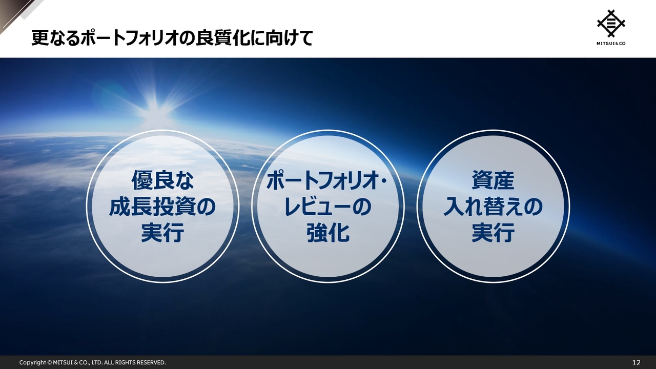 豊富な案件パイプラインの中から厳選した、優良な成長投資の実行、ポートフォリオ・レビューの強化、並びに資産入れ替えの実行によって、当社事業ポートフォリオを絶えず良質化することは当社の経営の根幹と考えています。投資家のみなさまの期待に応える結果を出せるように、今後も継続的に取り組んでいきます。