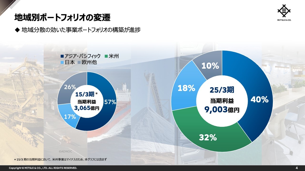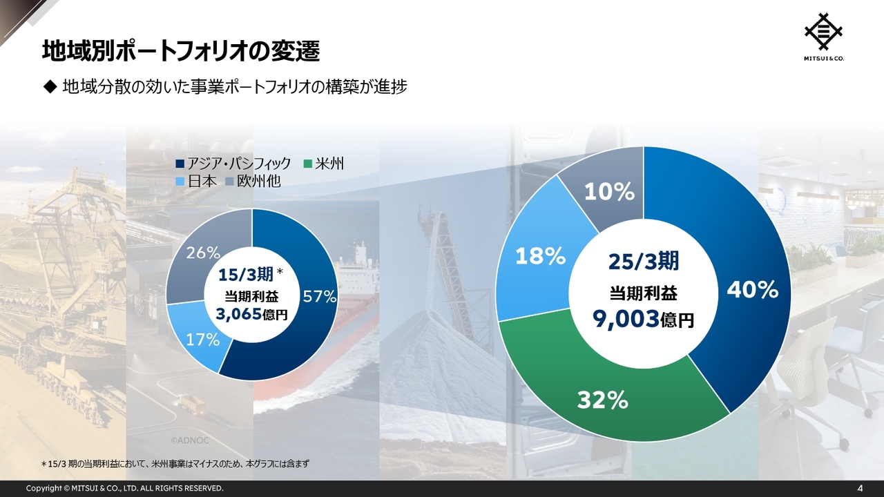 地域別のポートフォリオの変遷についてご説明します。地域別で見た場合に、2015年3月期は一過性要因を主因に米州事業は赤字となっていましたが、ここ10年で各地域において取組み・収益が伸長し、特に米州における収益力が高まり、足元では地域バランスの取れたポートフォリオになっています。