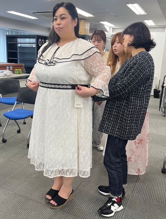 普段の洋服とドレスとではサイズ表記が乖離している…というお悩みを解決するために、長年衣服設計のための体型研究をしてきた日本女子大学の教授と共にプラスサイズのリアルな体型特徴をとらえた3Dアバターを作成し、4Lサイズをベースにプラスサイズ体型にフィットするオリジナルのサイズを作成。