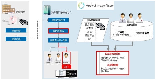 本発明は遠隔読影において、読影専門事業者などが読影依頼を受け付けた際に、複数の読影医の専門性や読影可能件数を考慮し、読影医ごとの振分適切度を算出することで自動的に担当する読影医を割り当てることができる技術です。専門性を発揮した高度かつ適切な量の読影を可能とし、読影の精度向上と読影関係者の働き方改革を支援します。