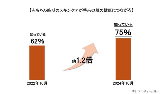 近年、乳幼児期のスキンケアへの関心が高まり「赤ちゃん時期のスキンケアが将来の肌の健康につながる」と感じている方は、2022年の62%から2024年には75%へと増加※2しています。赤ちゃんの肌トラブルの主な要因として「乾燥」「汗」「こすれ」が挙げられます。特にパンツ期には、自分でお肌を引っかいたり、活発に動くことで汗をかいたりするため、肌トラブルが発生しやすいことが分かっています※2。