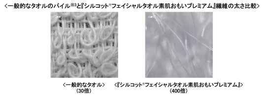 ・一般的な布製タオルのパイル※3の約1/20の極細繊維を使用しています。繊維が細くきめが細かいので、まさつを極力少なくすることができます。