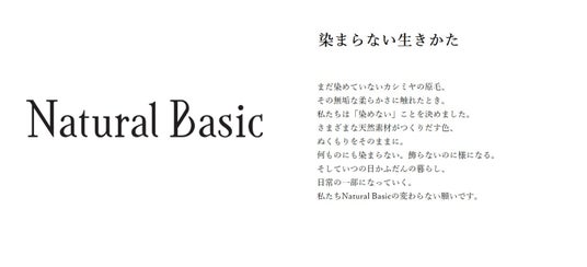 2000年にスタートしたNatural Basicは、2024AWからブランドロゴとブランドコピーを刷新しました。質の良いカシミヤ素材を中心に天然素材が持つ風合いや色合いを大切にする、また地球環境にも優しい生産方法のひとつである”染めない”ものづくりを通じて、素材の良さをそのまま感じられるような企画の提案をおこないます。