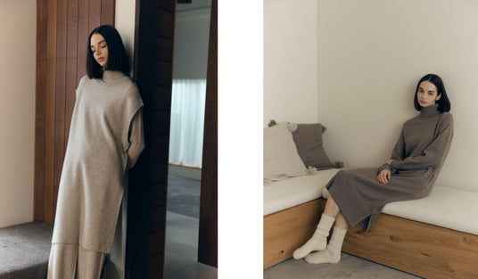 カシミヤ素材を使用した贅沢なウェアリングシリーズは柔らかさ、暖かさはもちろん軽さが特徴です。今年のコレクションはロングワンピースやセットアップで着用できるアイテムもあり、全身カシミヤ素材の贅沢感のあるスタイリングが楽しめます。