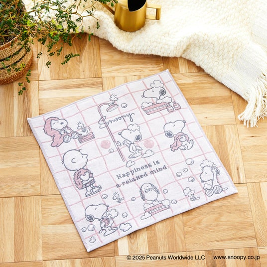 バスタイムを楽しむスヌーピー。タイルを思わせるデザインやシャボン、優しい色合いなどリラックス感ある一枚。 眺めていると癒されそうです。