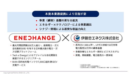 伊藤忠エネクス株式会社(本社:東京都千代田区、代表取締役社長CEO:吉田朋史、以下「当社」)は、本日、ENECHANGE(エネチェンジ)株式会社(本社:東京都中央区、代表取締役CEO:丸岡智也、以下「ENECHANGE社」)と資本業務提携に関する契約を締結いたしました。また、当社は、ENECHANGE社の第三者割当増資を引き受け、同社の筆頭株主(所有株式数7,375,000株、議決権保有比率17.45%)となる予定です。