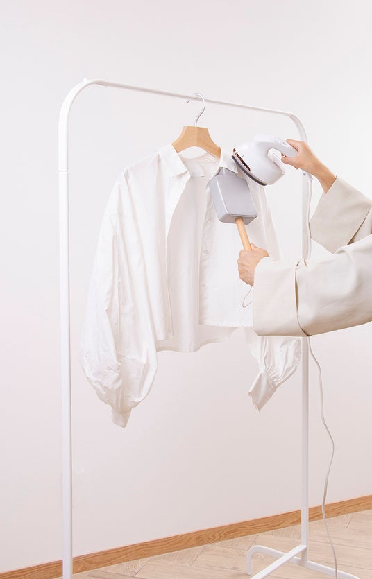 収納用ストラップで吊り下げられるため、場所を取らずに収納できます。シワに気づいたその場で、すぐにケアできます。