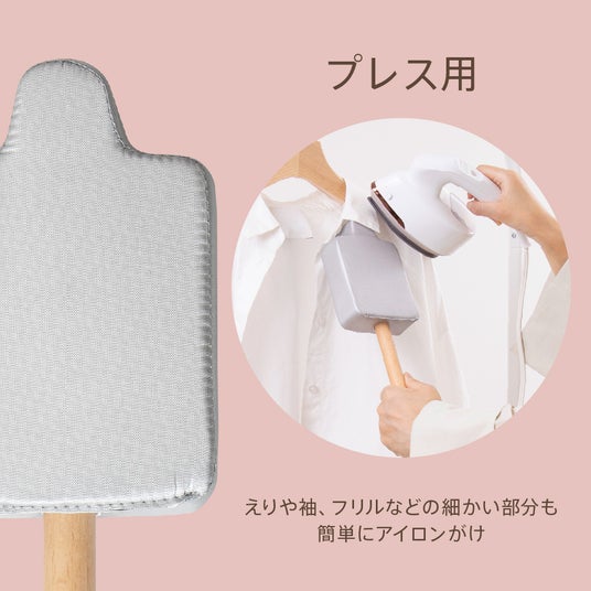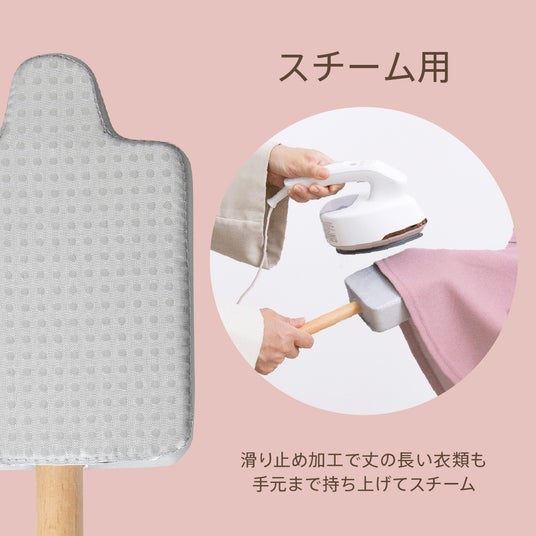 かけ面の両側にアルミコーティングを施し、熱を効率よく伝えます。⽚面に滑り止め加工を施すことで、丈の長い⾐類を持ち上げて作業できます。両面ともにアイロン・スチーマーに対応しており、用途に合わせてお好みの面をご使用いただけます。先細構造により、襟元や袖口まで丁寧に仕上げられます。