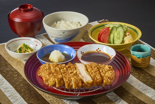 ◆手付けとんかつ定食 1,390円(税込 1,529円) ・手付けとんかつ、サラダ、ご飯、味噌椀(税抜きプラス280円でミニそばもしくはミニうどんに変更することができます)、香の物