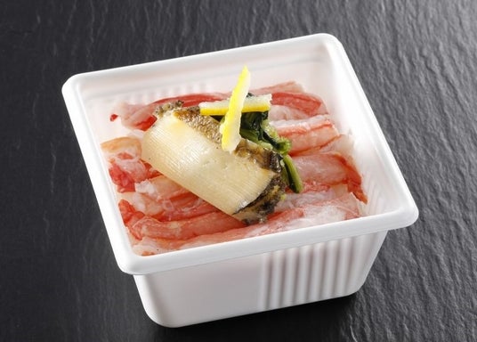かにとあわびのミニちらし 税込500円みずみずしくうまみのつよい紅ずわい蟹をふんだんに盛ったミニちらしには相性の良い壬生菜漬けとふっくらたきあげた煮あわびをあしらいました。柚子の薫りとともにお楽しみください。