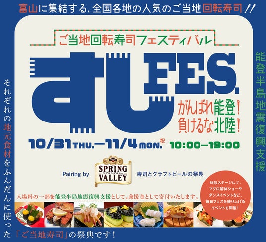 株式会社フーズネット(本社・大阪府大阪市、代表取締役社長・加藤誠)が運営する「活⿂廻転寿司にぎり長次郎」 「廻転寿司CHOJIRO京都」は10月31日(木)から11月4日(月)まで、富山県高岡市のテクノドームで開催されるご当地回転寿司フェスティバル「すしFES.」に出店を決定しましたのでお知らせいたします。開催主旨「能登半島地震復興支援」に賛同し、地域の活気づくりに貢献します。
