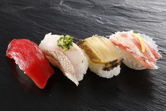 長次郎おすすめ4貫 税込500円まぐろ赤身、壬生菜漬けをあしらった甘鯛、ふっくらたきあげた煮あわびのにぎりに、みずみずしくうまみのつよい紅ずわい蟹の小鉢寿司を添えました。
