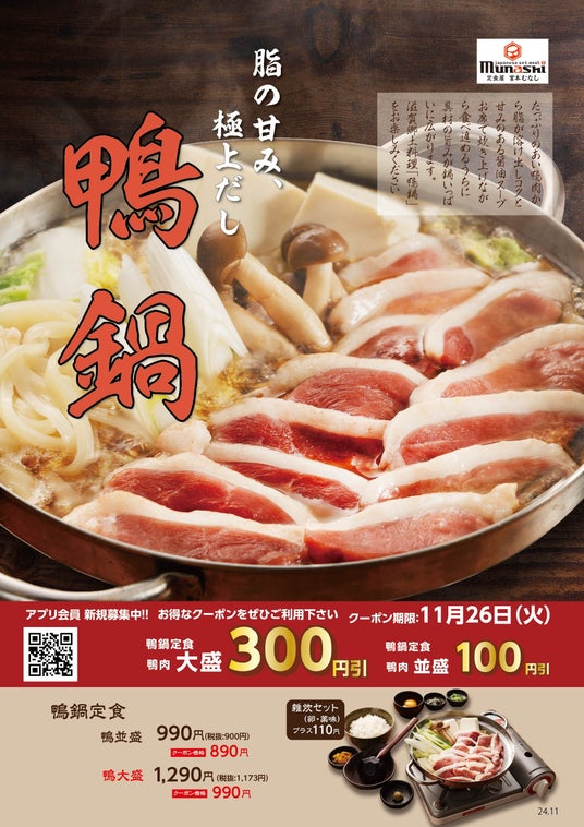 宮本むなし公式アプリでは、11月26日まで何度でも使える「鴨鍋定食100円引き・鴨肉大盛300円引き」クーポンを配信いたします。会員の方限定でご利用いただけるクーポンですので、この機会にぜひ宮本むなし公式アプリをダウンロード&会員登録ください。