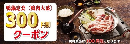 宮本むなし公式アプリでは11月26日(火)まで使用出来る「鴨鍋定食100円引き・鴨肉大盛300円引き」クーポンを配信しますので、よりお得にご利用いただけます。