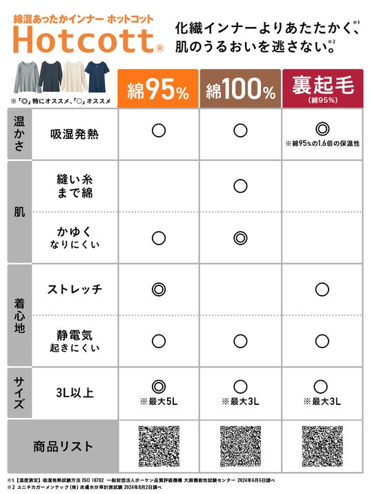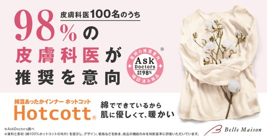株式会社千趣会(本社:大阪市 代表取締役社長:梶原健司 以下千趣会)の通販事業ベルメゾンが展開する、シリーズ累計販売枚数1,500万枚※1を超える綿混あったかインナー「Hotcott(ホットコット)(R)」が、この度、エムスリー株式会社(本社:東京都港区/代表取締役:谷村格)が提供する「AskDoctors(アスクドクターズ)評価サービス」で「AskDoctors医師の確認済み商品」マークを取得しました。吸湿発熱機能がある機能性インナーとして、初めての認定となります。