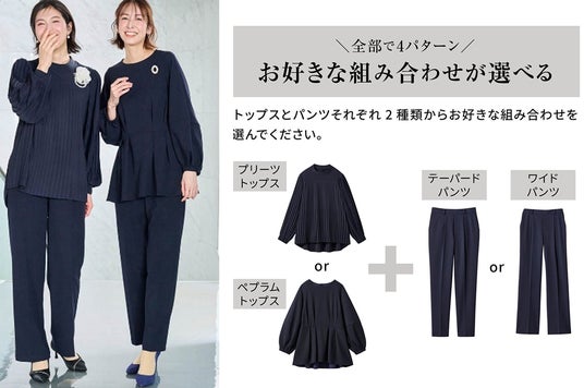 組み合わせを自由に選べるブラウス(プリーツブラウス、ペプラムブラウス)、パンツ(ソフトワイドパンツ、テーパードパンツ)の2点セット