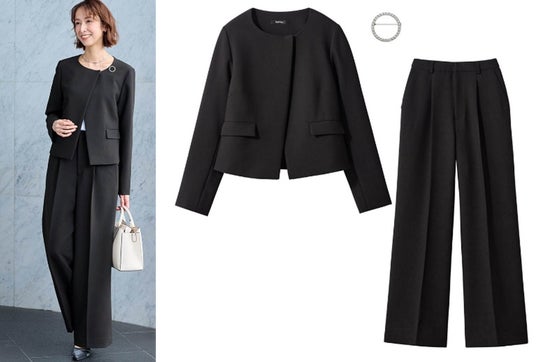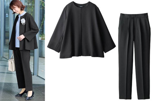 必要最低限で準備したい方に最適、こなれて見えるフレア感のあるジャケットとテーパードパンツの2点セット