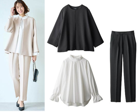 人気商品に新色のグレージュが登場、フレア感のあるジャケット、テーパードパンツ、フリルをあしらったブラウスの3点セットで迷わずコーディネート