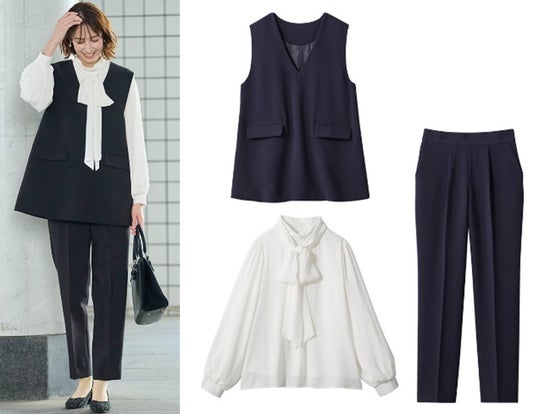 ほどよくゆとりがあるシルエットに、Vネックで胸元をすっきり見えるベストにテーパードパンツ、裏カットソー付きボウタイが取り外しできる2WAYブラウスの3点セット
