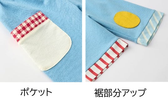 「5代目スイちゃんになれる!トップス&ボトムセット」は、どの角度から見てもスイちゃんになれるよう、衣装のデザインや色合いを細部まで忠実に再現しました。トップスはアシンメトリーの裾とバルーンシルエットで立体的のあるデザインを採用し、前身頃から後見頃にわたる部分には、大きなアップリケを付けています。パンツは左右の長さが違うデザインで本物のスイちゃんに近くなるように着用時のバランスにこだわりました。見た目の可愛さだけでなく、綿100%の動きやすく快適なカットソー素材を使用するなど、子どもの着やすさにも配慮しています。