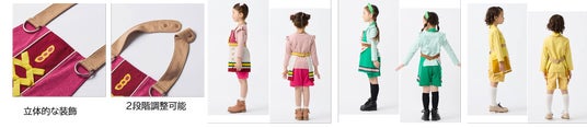 「ヨモギ・クリン・マメコになれるコスチューム風エプロン」は、各キャラクターのコスチュームの配色やデザインを忠実に再現し、リボンや金属風の付属品など立体的な装飾を加えた仕様です。肩ひもとウエスト背面にはスナップボタンが付いており、服の上から簡単に着用できます。料理のお手伝いの際だけではなく、ハロウィンなどの仮装にも活用するなど幅広く楽しんでいただけます。