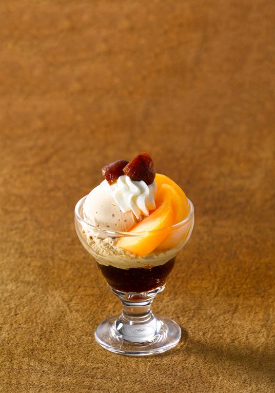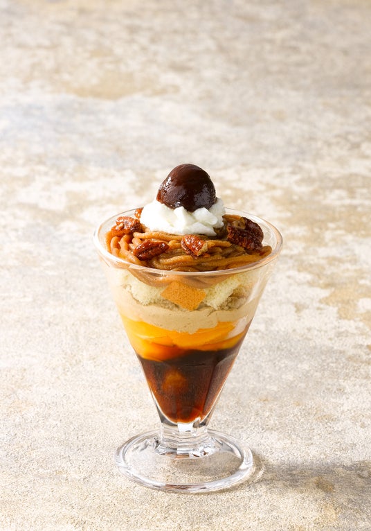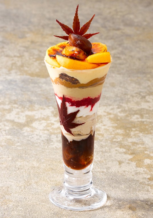 マロンクリーム、シフォンケーキ、渋皮栗のアイス、ほうじ茶クリーム、柿を重ねたパフェ。グラスの底には、ほうじ茶ゼリー。ほろ苦さとさらっとした甘さの余韻が楽しめます。ピーカンナッツをトッピングして香ばしさを添えました。