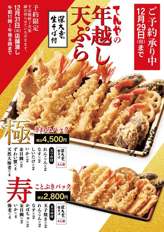 『年越し天ぷら』は、一年を締めくくる年越しの食卓のお供として、てんやで約30年にわたり販売する大晦日限定商品です。今年もご愛顧いただきました感謝の気持ちを込めて、生そばが付いた盛合わせパック『極』 『寿』と、『天然大海老2本』の3商品を提供します。